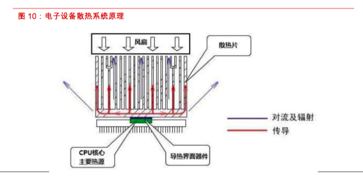 在热力学中,散热就是热量传递,方式主要有热传导,热对流和热辐射等三种。根据热的传递方式,电子设备散热系统可以由风扇、散热片(如石墨片、金属散热片等)和导热界面器件组成。导热界面器件功能是填充发热元件与散热元件之间的空气间隙,提高导热效率,通常用于通讯设备、计算机和外设、功率变换设备、存储模块、芯片级封装等领域,而散热片通过导热界面器件与电子元件表面接触,利用其在水平方向上的导热性,迅速降低电子产品工作时发热元件所在位置的的温度,使得电子产品温度趋于均匀化,扩大散热表面积以达到降低整个电子产品的温度,提高电子产品的工作稳定性及使用寿命。