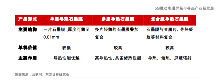 从产品形式角度来看,高导热石墨膜主要分为单层高导热膜、复合型高导热膜和多层高导热膜等多种类型。其中,单层高导热膜应用范围最广,复合型和多层高导热膜是在单层高导热膜基础上为满足客户更多的设计功能和需要与铜箔或者多片石墨膜复合而成。其中,单层高导热膜主要强调其优越的导热系数;多层高导热膜在具有高导热性能的同时还有一定的储热性能;复合型高导热膜兼具导热和储热性能,同时具有一定屏蔽辐射作用。5G时代的智能终端产品伴随更高的功耗和散热需求,同时兼具零部件创新升级大势,因此复合型和多层导热石墨膜有望迎来更广泛的应用。