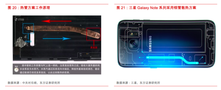 同时,随着5G时代的临近,各智能手机厂商均在近期发布的旗舰机型中加大散热方案的创新和应用力度,为后续的规模导入做准备。其中,热管散热技术作为PC机领域的主流散热方案,已逐渐被搭载于智能手机中。热管方案又常被人们以“水冷散热技术”所认知,在手机中搭载铜制散热管,并在导管中加入特质的导热液体(水或乙二醇),吸收手机核心元件发出的热量后,导热液体逐渐汽化并在导管内流动,当流动到低温处时将释放热能凝结成液态,完成手机热量的快速转移,并通过与热管连接的固定散热材料将热量散出。