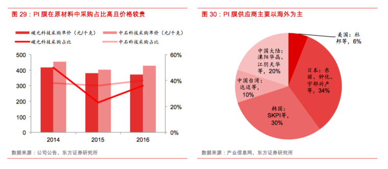 其中导热石墨膜的主要原材料为聚酰亚胺(PI膜),是一种高性能的绝缘材料,具有较高的技术壁垒,全球范围内高性能的聚酰亚胺生产厂商较少,主要集中于美国和日韩,因此PI膜价格波动对导热石墨膜产品毛利率具有较大影响。自2016年以来,随着下游需求快速提升,PI膜基本处于供不应求阶段,采购价格有所反弹,未来随着供给端新增产能陆续开出,供需关系有望保持稳定。