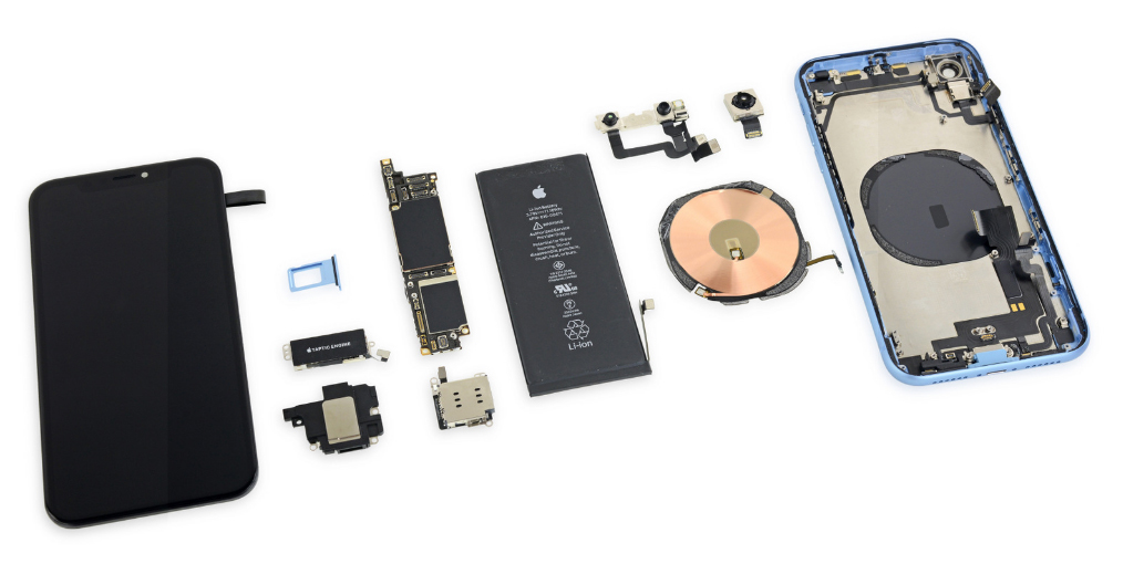 屏幕非常轻松就与机身分离。观察内部情况,发现XR 的 SIM 卡槽更靠近底部,屏幕下方能看到矩形电池和矩形主板,看起来像是 iPhone 8 和 X 的结合。