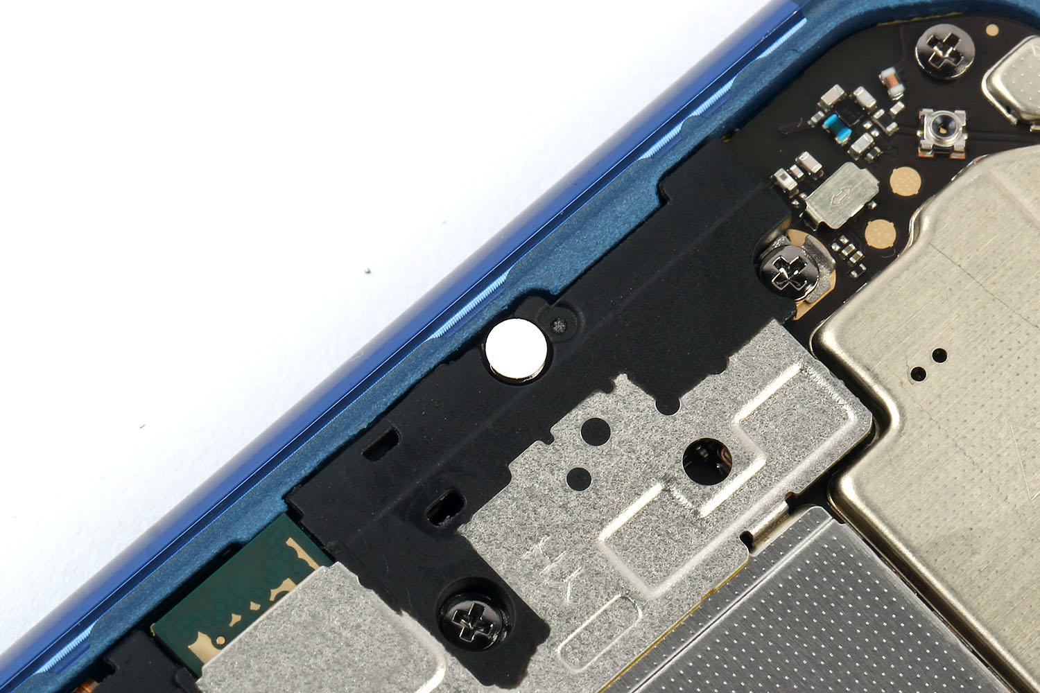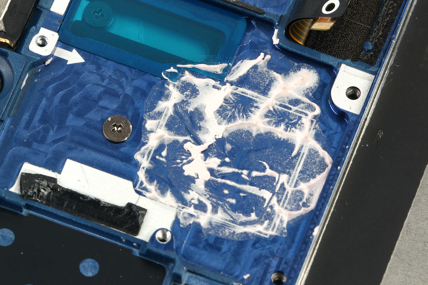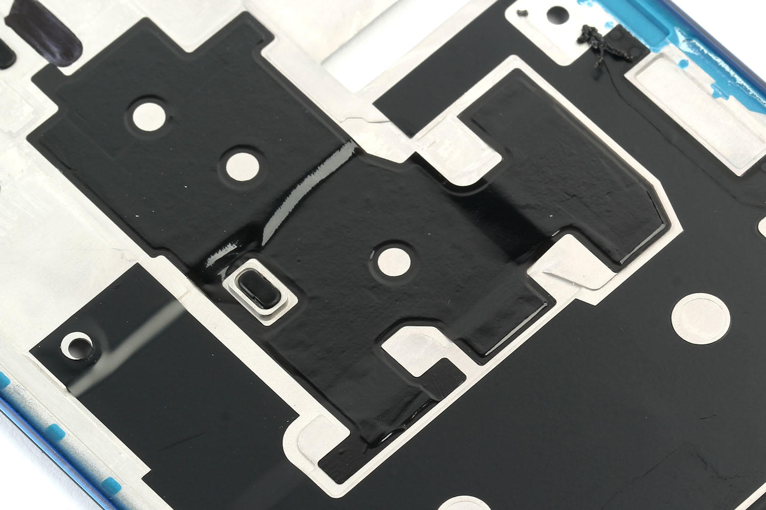 屏幕通过黏胶固定在中框,屏幕背面覆盖了一层泡棉作为保护,底部则有一层石墨贴用于散热。