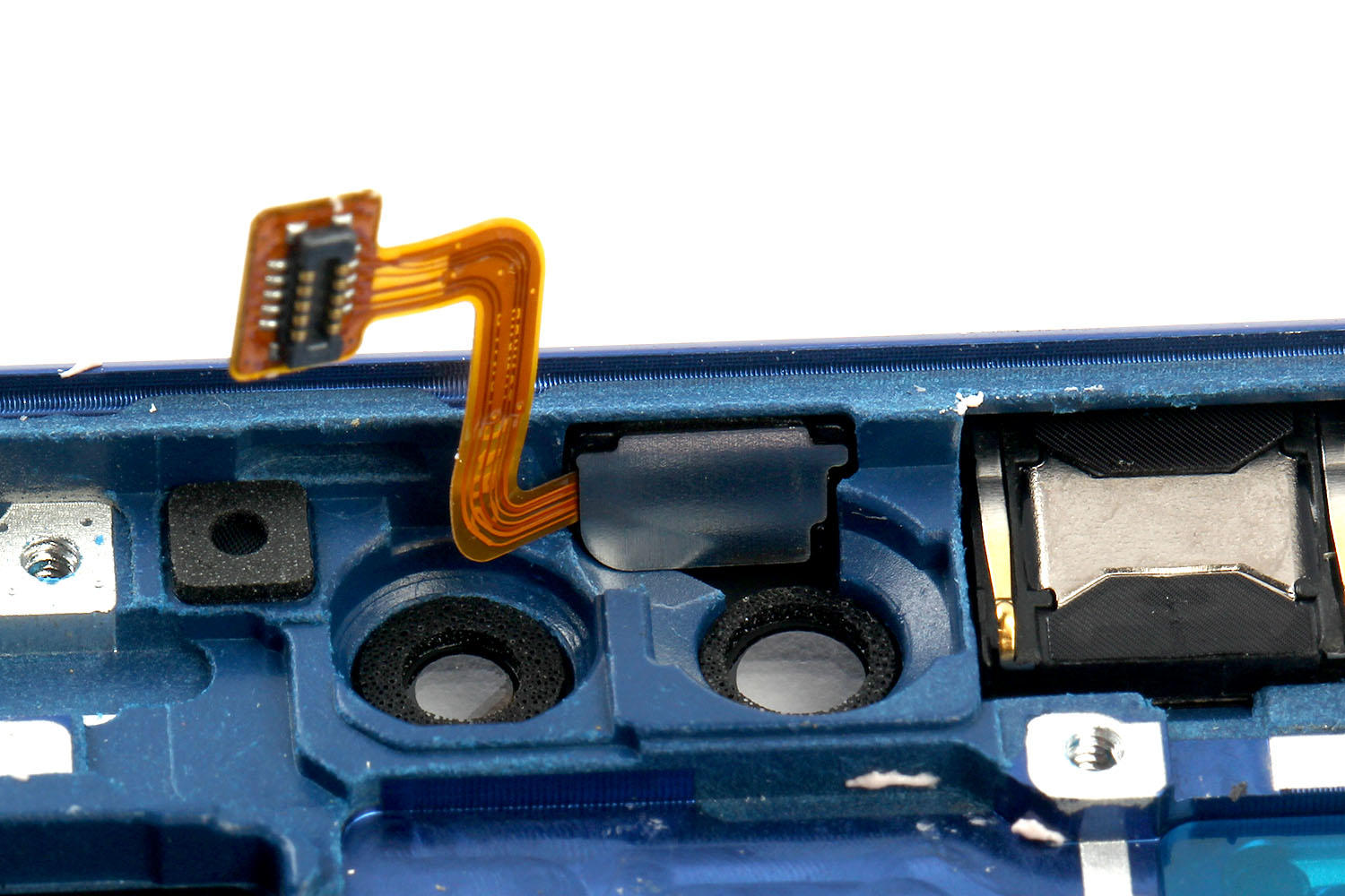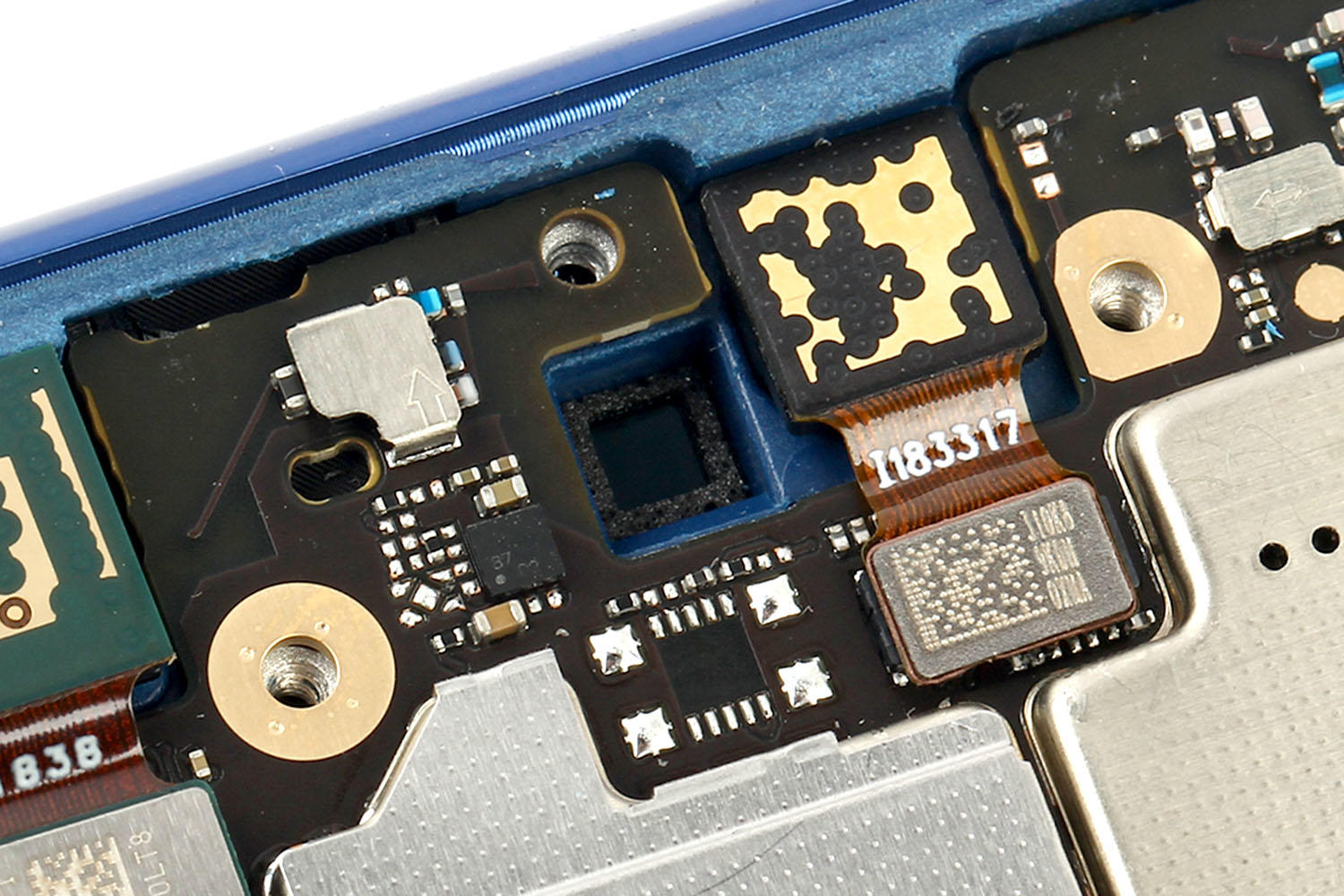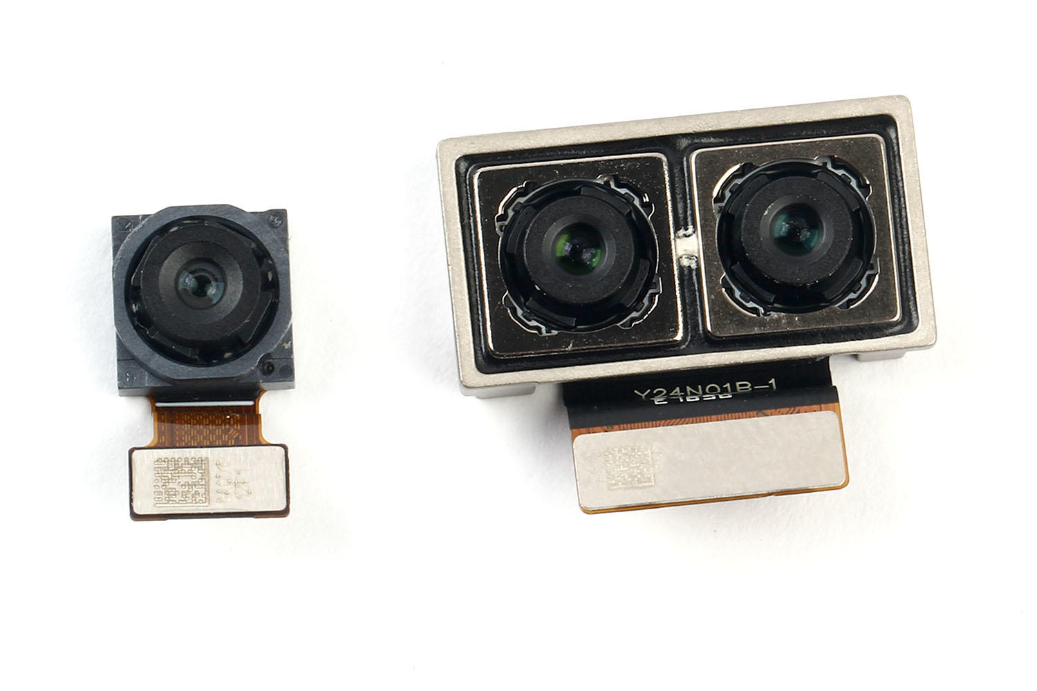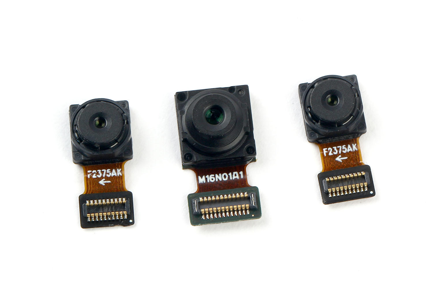 而前置摄像头采用了单个摄像头独立一个模块设计,整个前置的配备为2 颗 200 万像素红外摄像头 + 1 颗 1600 万像素彩色摄像头,其中彩色摄像头同样采用索尼 IMX371 传感器,其余两颗红外摄像头则由邱钛科技生产。