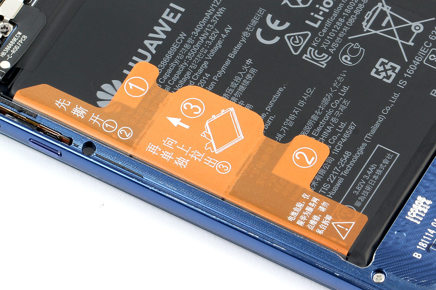 电池容量为3400mAh ,由欣旺达生产。电池通过两个 BTB 接口与主板相连。取出电池后可以看到电池背面是由一张具粘性的薄膜固定。