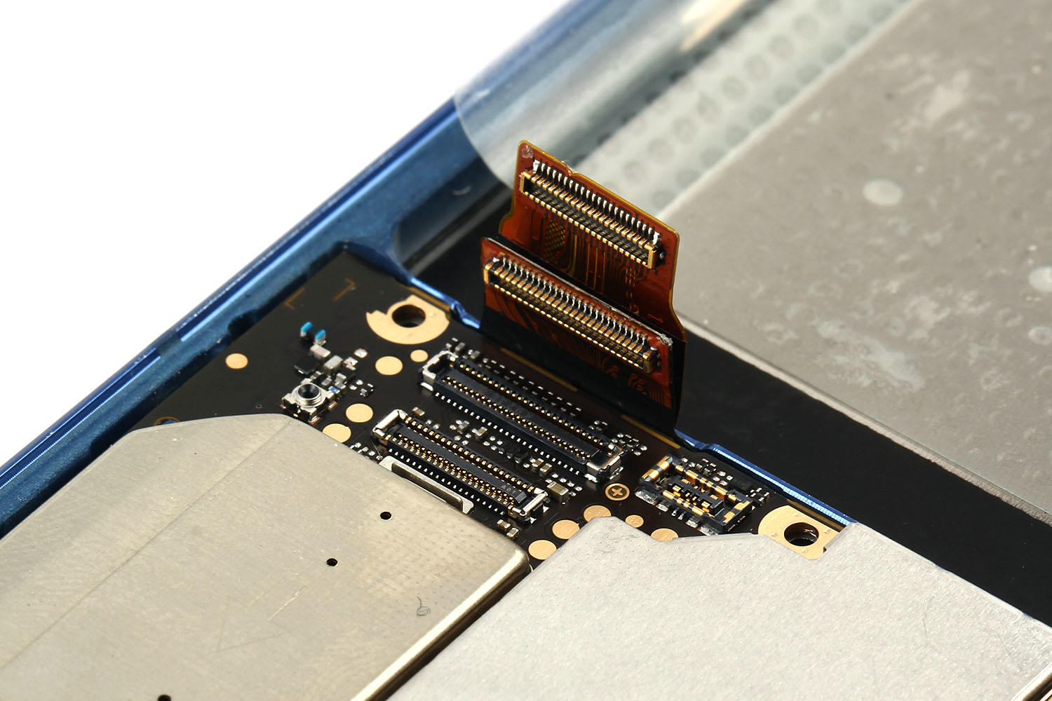 位于主板右下角的位置,有两条呈堆叠状的FPC 软板。这两条 FPC 软板连接的分别是屏幕和副板。