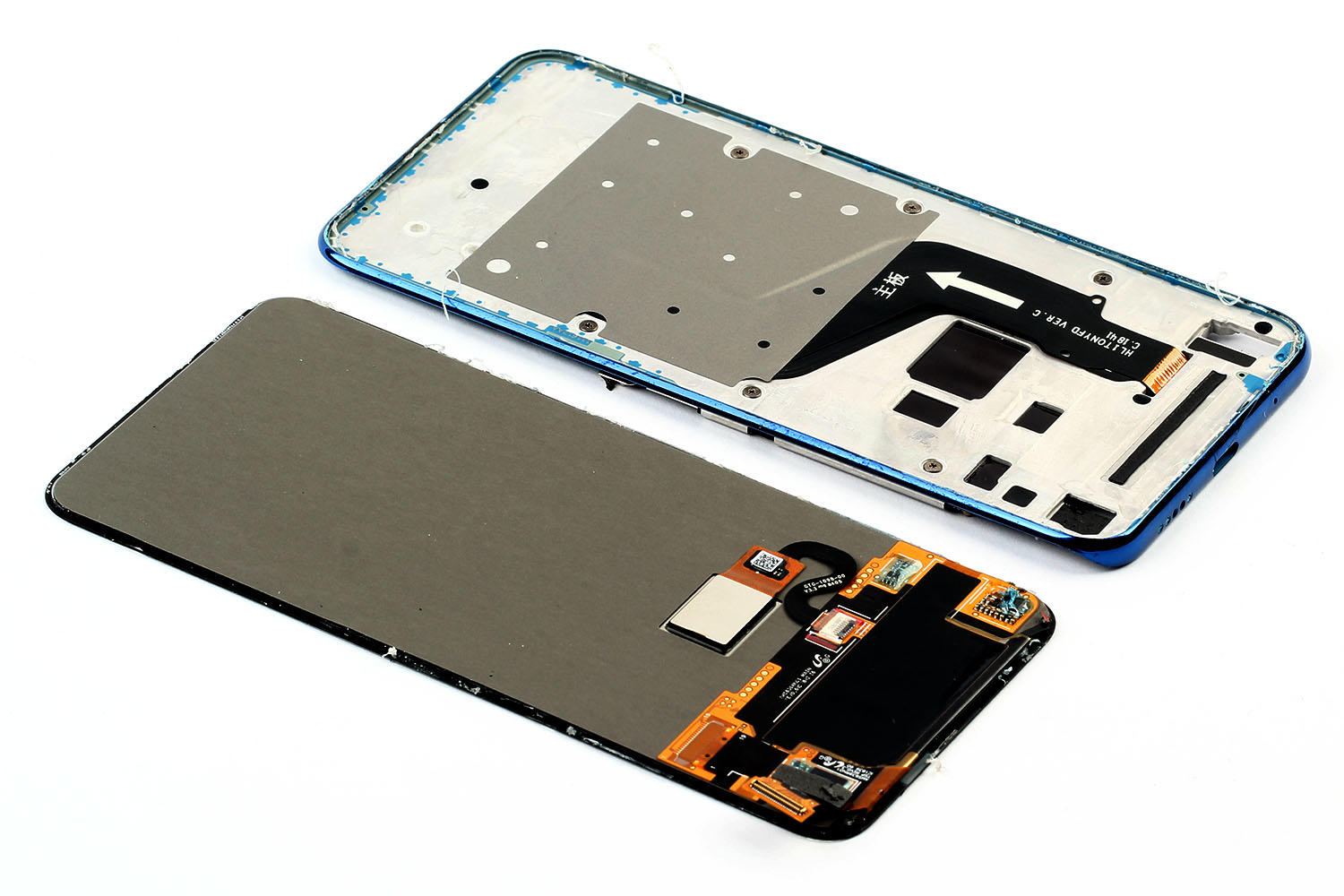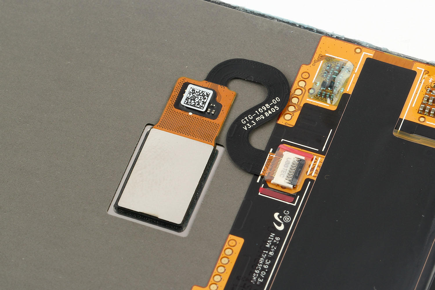 屏幕指纹识别模通过点胶固定在屏幕背面,FPC 软板通过 ZIF 连接器进行连接。指纹识别模块由汇顶科技提供。