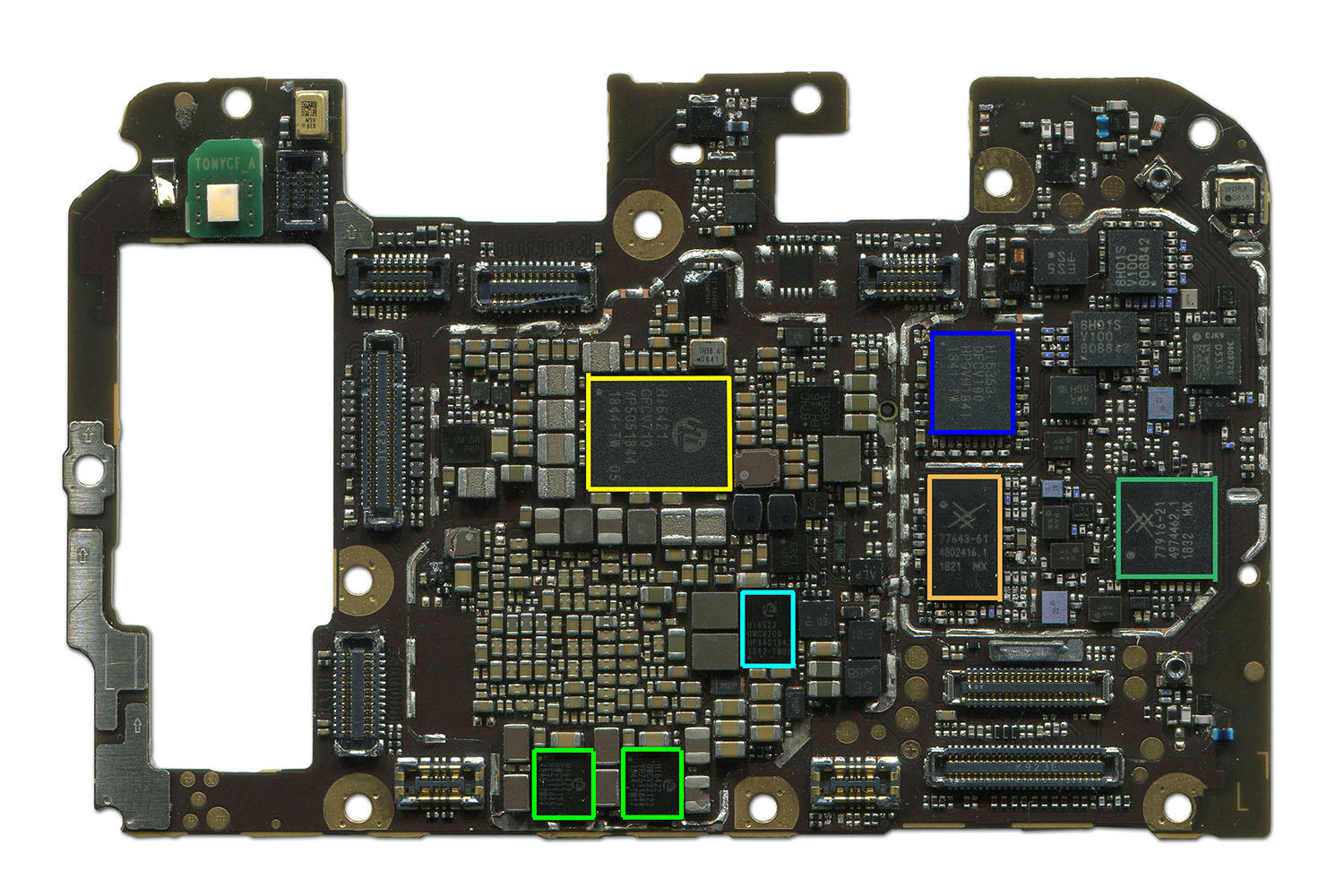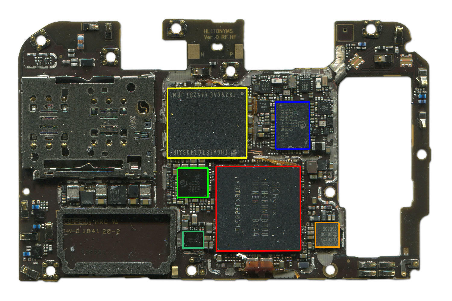 红色:SK Hynix-H9HKNNNEBM3U-6GBLPDDR4X DRAM芯片,Hisilicon-Hi3680-麒麟980八核处理器
