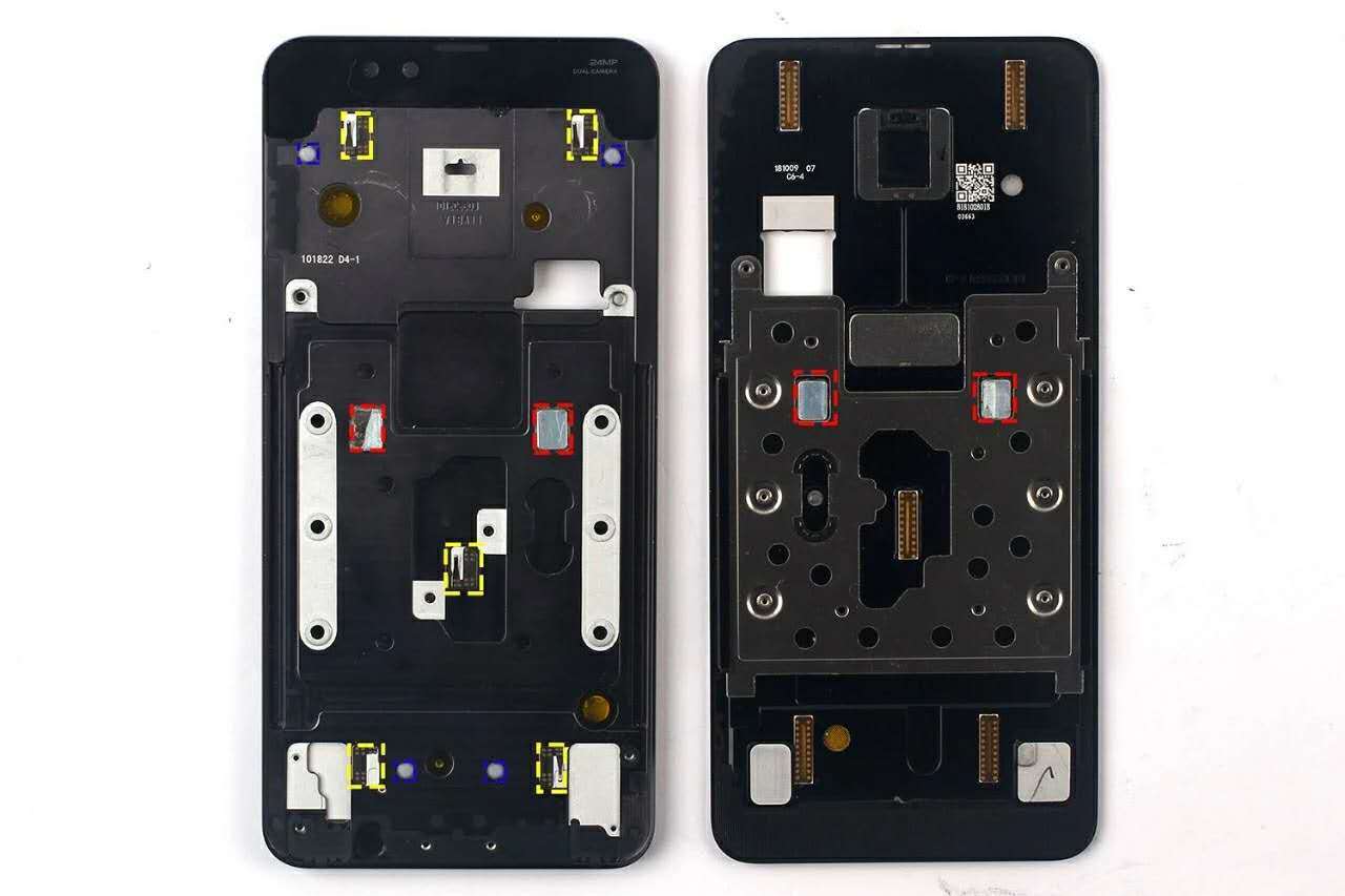 荣耀 Magic 2 采用了蝶式五轨滑屏结构设计,滑轨之间有一颗螺丝进行固定,侧键软板用双面胶贴在中壳侧面的凹槽内。断开连接将中壳取出,即可开始继续拆解荣耀 Magic 2 的前半部分。