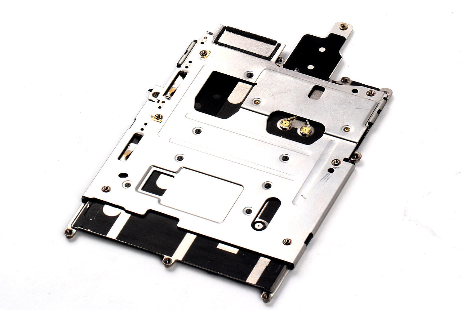 中框内支撑的正面有一层石墨贴纸,金属滑轨结构由若干颗十字螺丝方向固定在支撑板背面。
