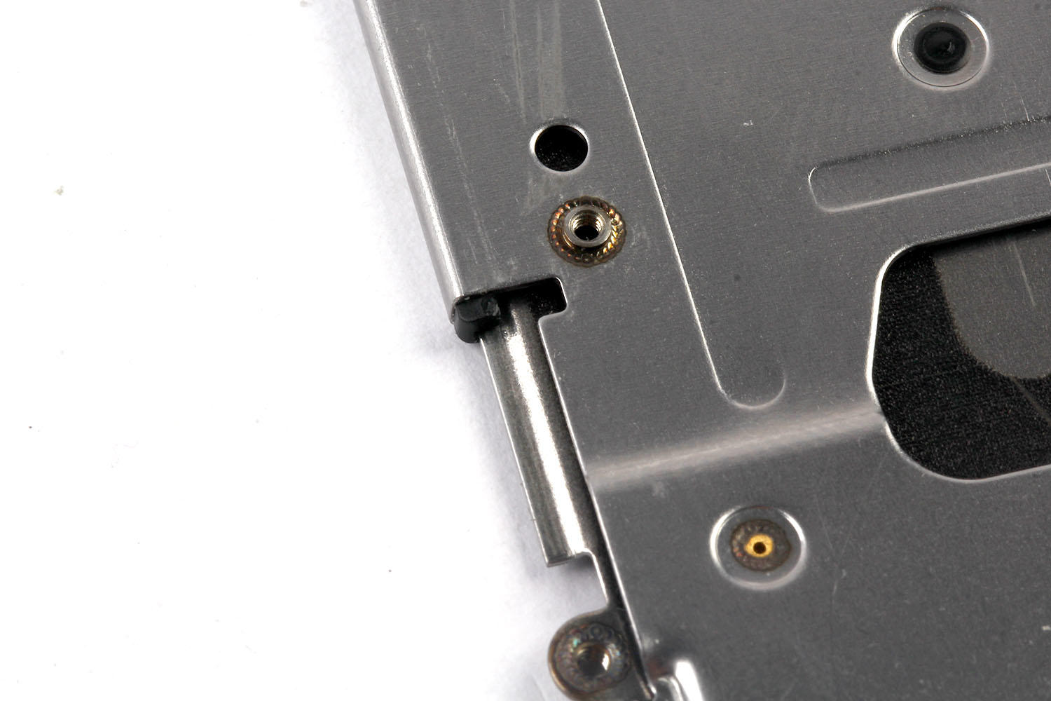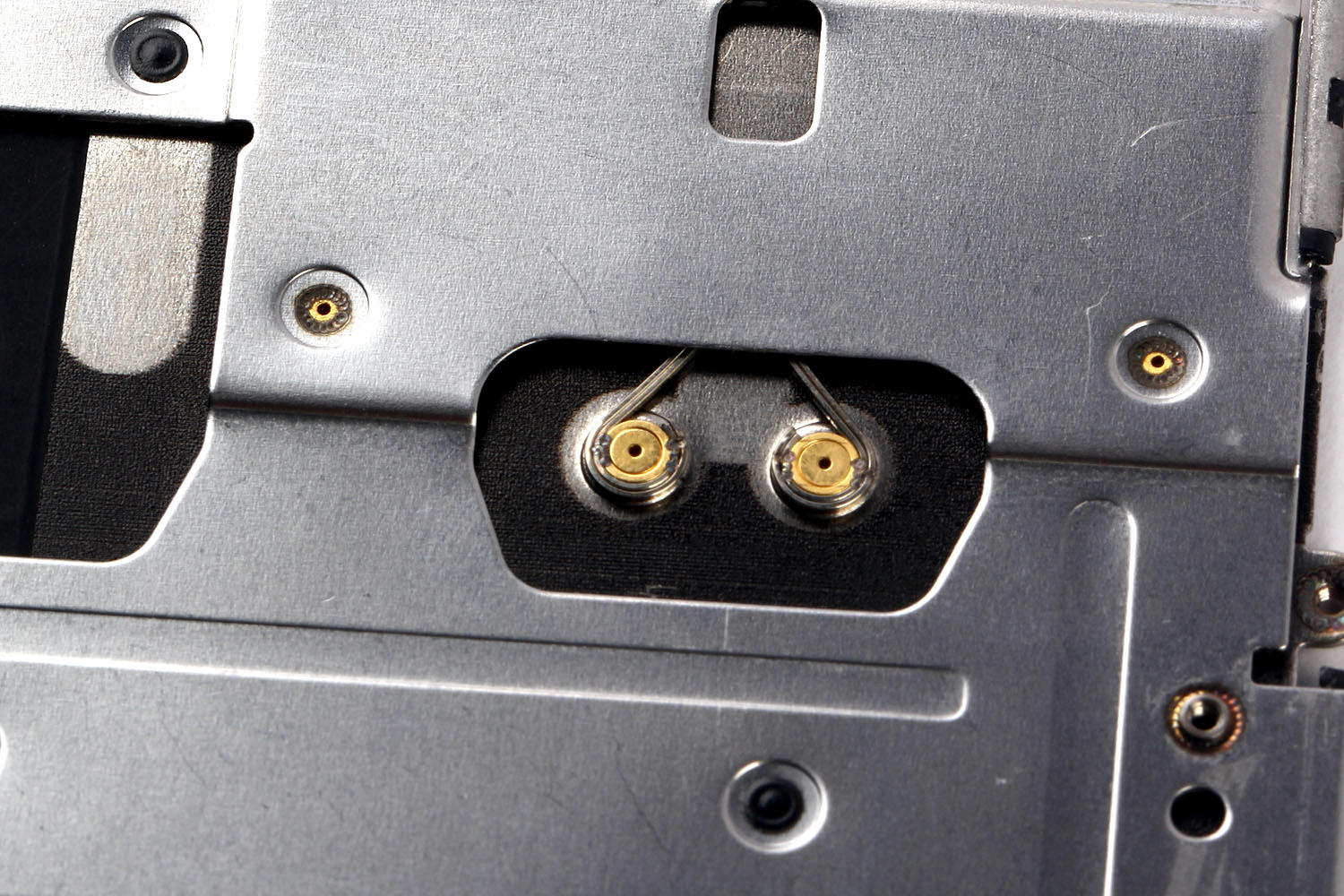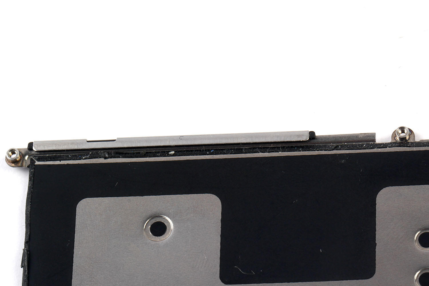而中间的两根伸缩弹簧则用于控制上下滑动的幅度。靠近屏幕一侧的钢板上用了6 颗十字螺丝将滑动结构固定在屏幕那一侧,而固定在另一侧的钢板则用了 10 颗十字螺丝固定在后壳。