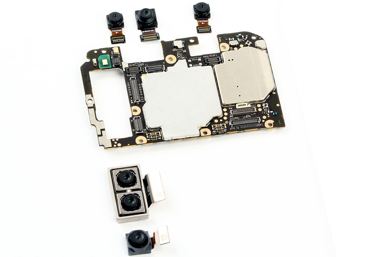 后盖与主板之间涂了一层散热硅脂,在拆卸主板时需将摄像头模组一并拆除,拆卸时可以发现荣耀 Magic 2 的摄像头模组竟多达 5 个,共计 6 个摄像头。