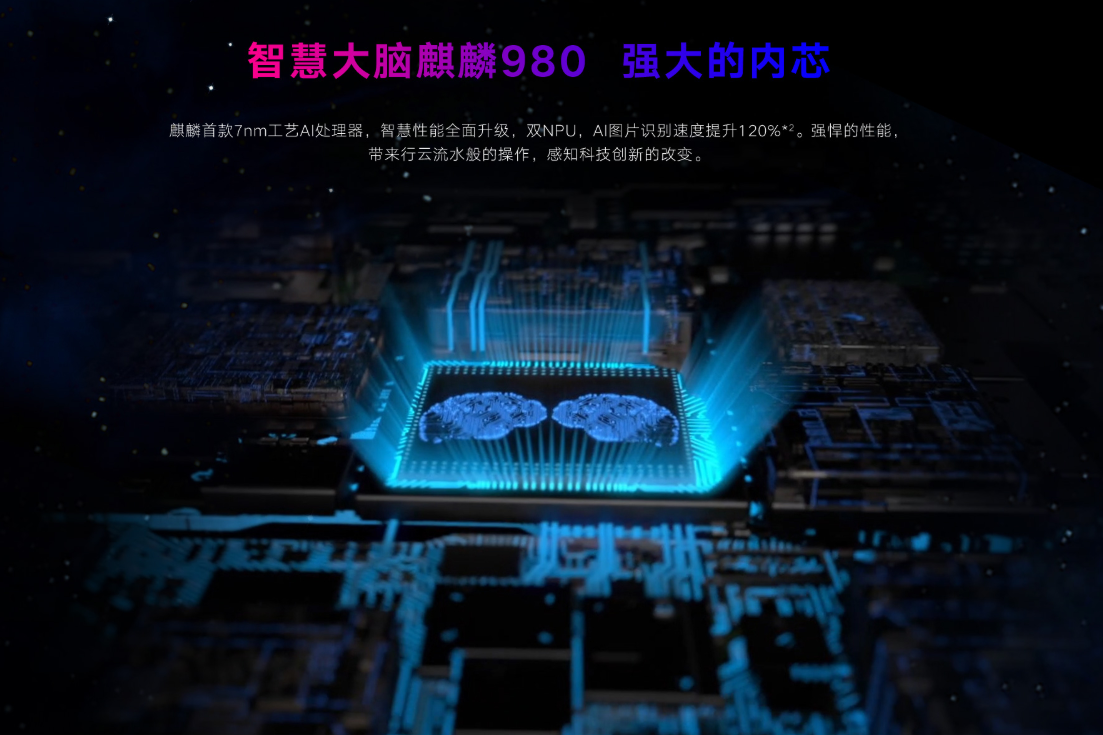 麒麟980 采用 7 纳米制程工艺,相比起前一代,麒麟 980 在 CPU、GPU、NPU 上都做出了全面升级,其中 NPU 采用了中科院寒武纪 1M 人工智能芯片,GPU 则采用了第三代 GPU Turbo 技术。