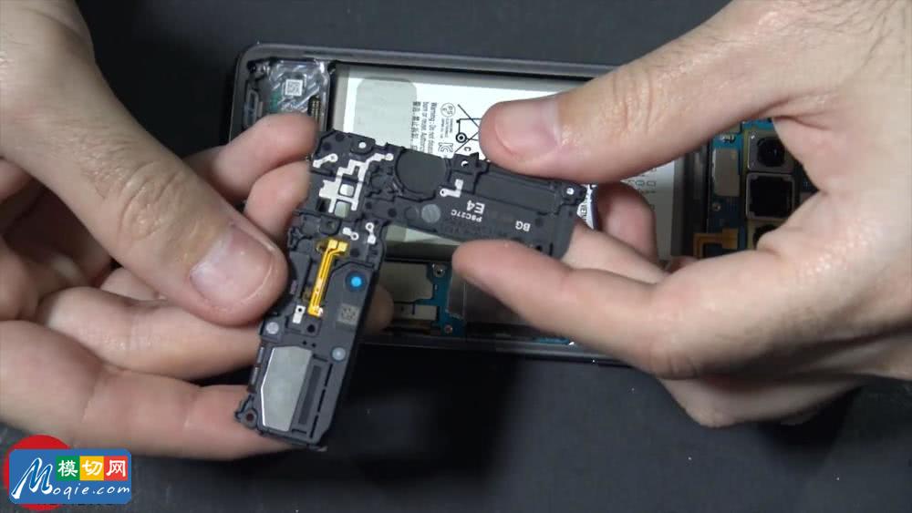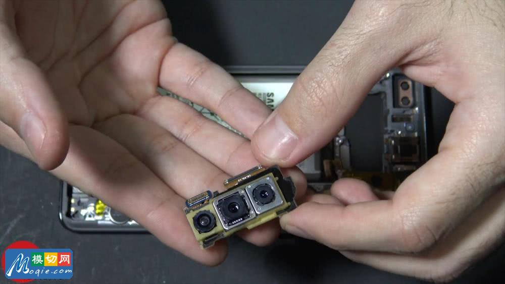 拿掉后壳之后,我们看到了Galaxy S10的内部,首先映入眼帘的是后置三摄像头模块以及用来固定电池的隔板。