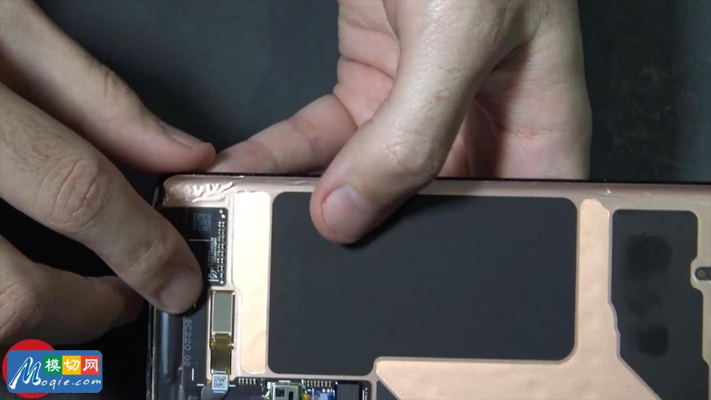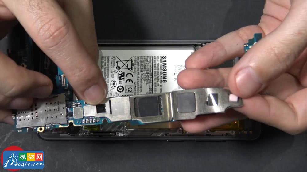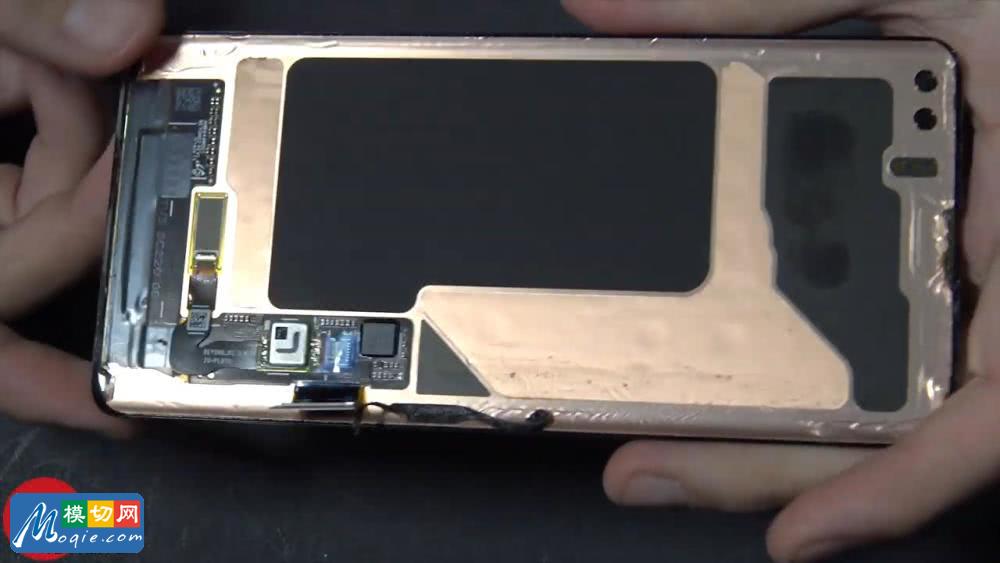 首先从拆解的过程中就能给我们带来惊喜。没错,我们看到Galaxy S10+的屏幕和后壳都单独与金属中框连接,所以想要更换屏幕的话就变得非常容易,只用塑料翘片就能将手机分离。总体来说,想要将Galaxy S10拆开,其实是非常简单的一件事。