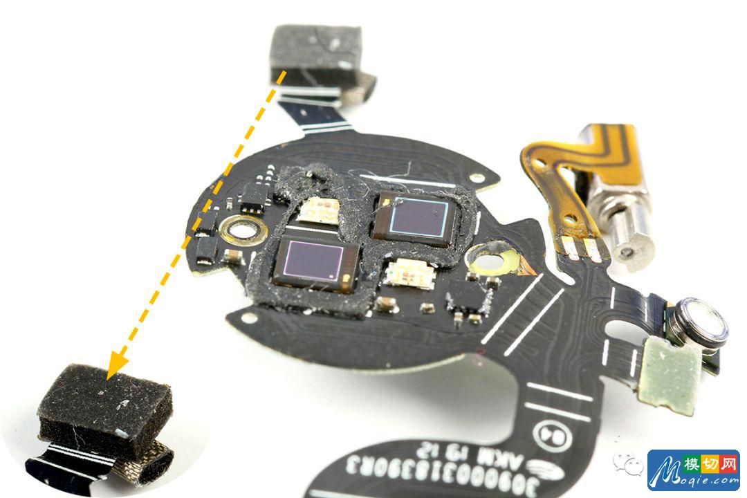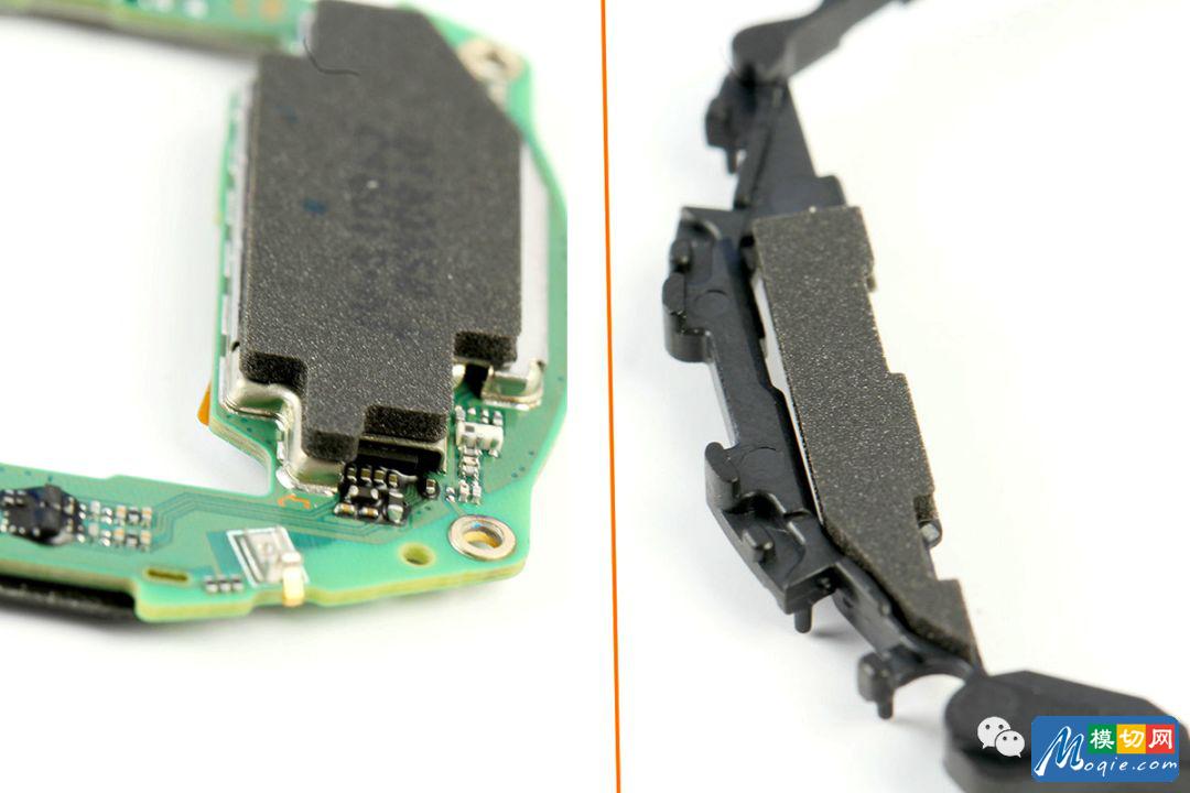 华为WATCH GT的心率传感器PCB板LED以及传感器周围贴有泡棉胶,同样心率传感器软板与天线之间贴有黑色较厚泡棉胶,也是起到绝缘和防震的作用。