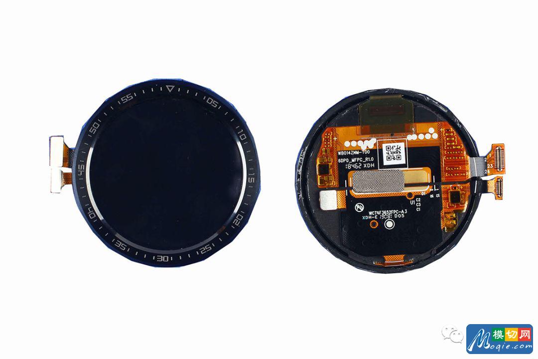 华为WATCH GT的屏幕为1.39英寸AMOLED 视网膜屏幕,屏幕背面贴有NFC天线线圈,具体型号为WB014ZNM-T00。