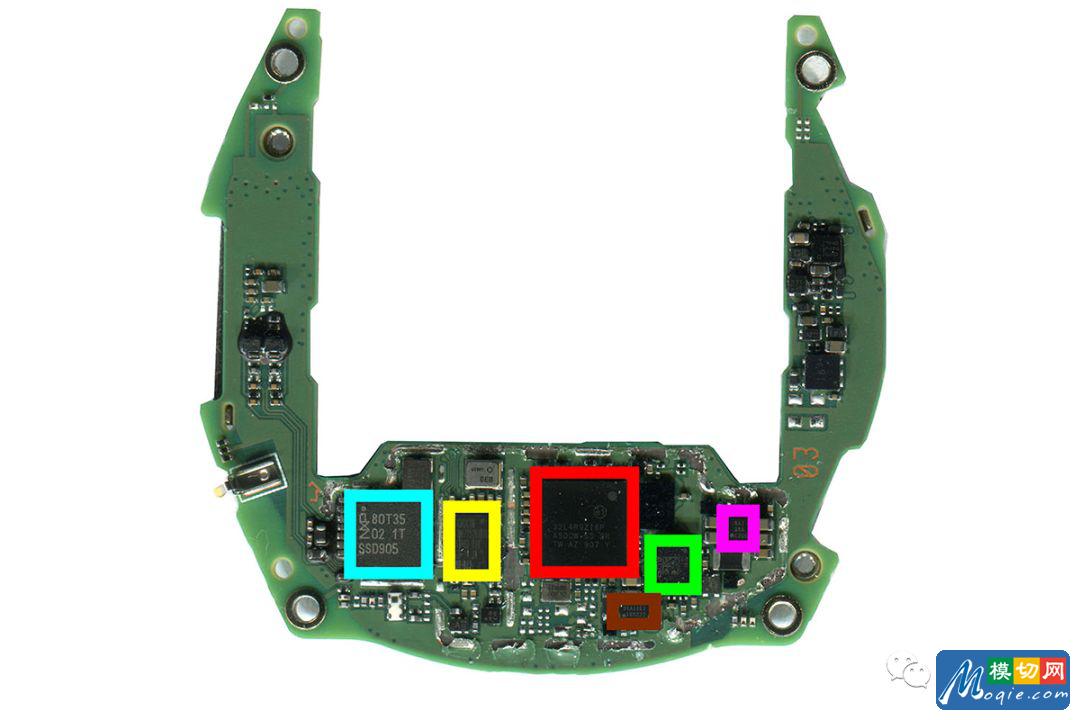 如华为手机中广受好评的麒麟芯片,在华为WATCH GT中并没有体现。另一个比较有趣的发现是,华为WATCH GT内部采用了已经离开了手机移动市场的老牌芯片厂商德州仪器的产品,包括有升压、降压和漏电负荷芯片。