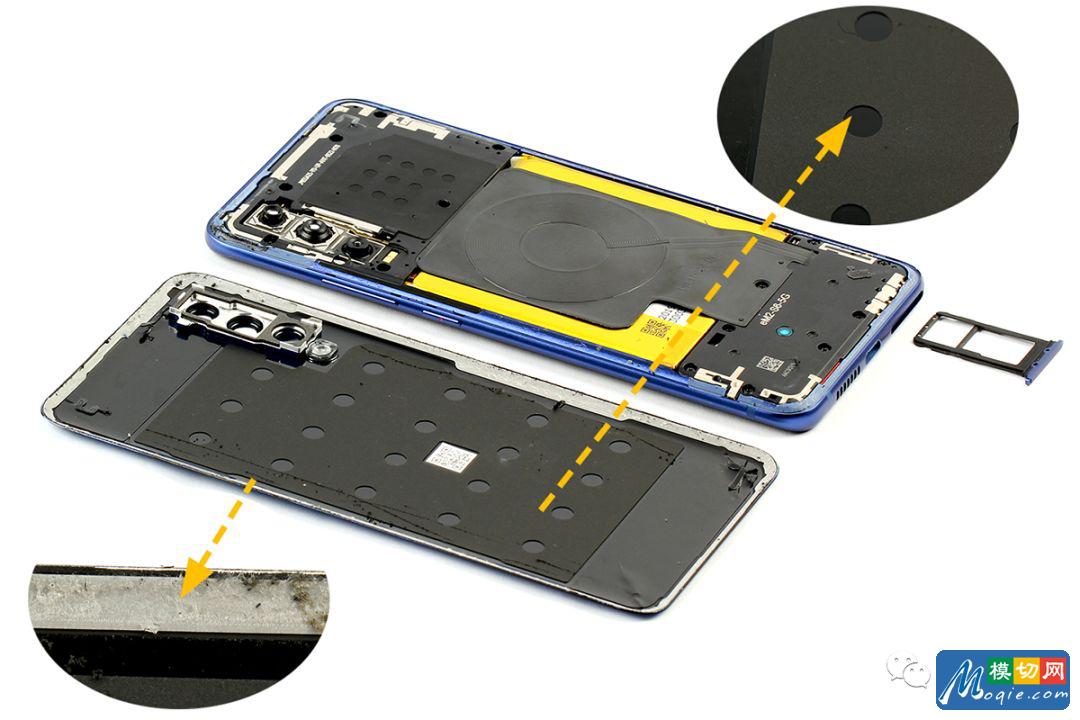 AXON 10 Pro 5G版的后盖与内支撑通过胶固定,使用热风枪加热后盖与内支撑缝隙处,加热温度约190℃,缓慢打开后盖,同时后盖上贴有大面积泡棉主要起保护作用。