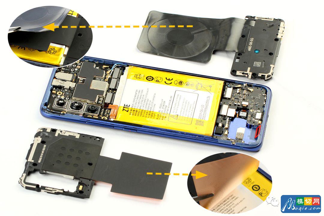 AXON 10 Pro 5G版的NFC线圈通过胶固定在主板盖上,有大面积铜箔延伸到电池位置用于散热。无线充电线圈表面包裹有散热石墨片,通过双面胶固定在电池上,下方带有胶带与扬声器固定。