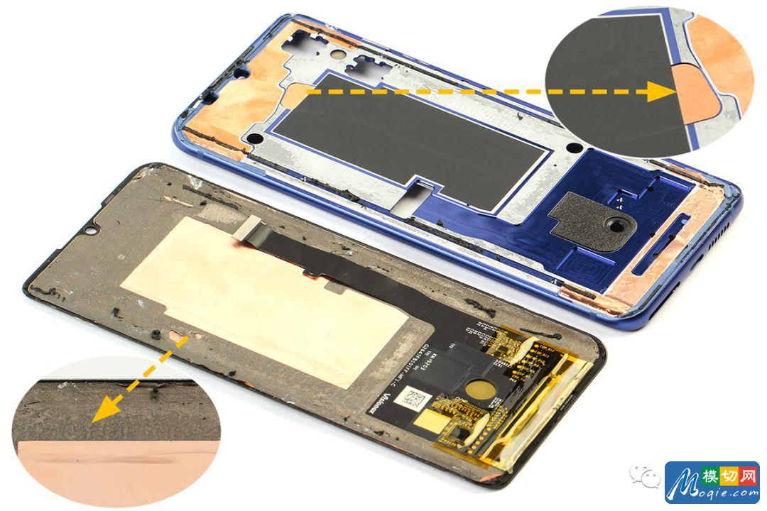 屏幕与内支撑通过胶固定,使用加热台加热屏幕到大约80℃,可将屏幕与内支撑分离。为保证散热,内支撑正面贴有液冷条延伸到电池位置。