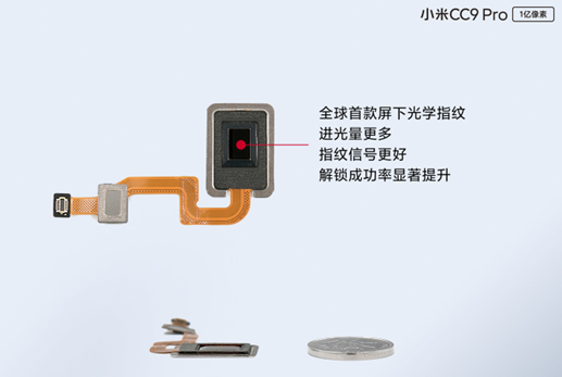 关于小米CC9 Pro上的全球首款超薄屏下光学指纹识别模组,官方拆机显示它的厚度约0.3mm,比1角硬币更薄,通过采用全新的微透镜+微准直技术,集合准直器方案和透镜方案两者的优势,使得其能接收到进光量充足、信噪比高、图像清晰的指纹信息,从而提高解锁成功率。