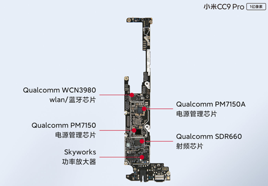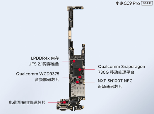 最后是主板,图片显示小米CC9 Pro的主板采用“L”型的异形主板,正面以射频芯片和电源管理芯片为主,背面排布高通730G SoC和内存闪存堆叠。小米CC9 Pro支持多功能NFC,采用了小米9/9 Pro同款的SN 100T芯片。而全新的电荷泵充电管理芯片的加入,配合Mi-FC高速充电技术,让小米CC9 Pro的30W疾速闪充能获得不输常规40W的高速充电体验。