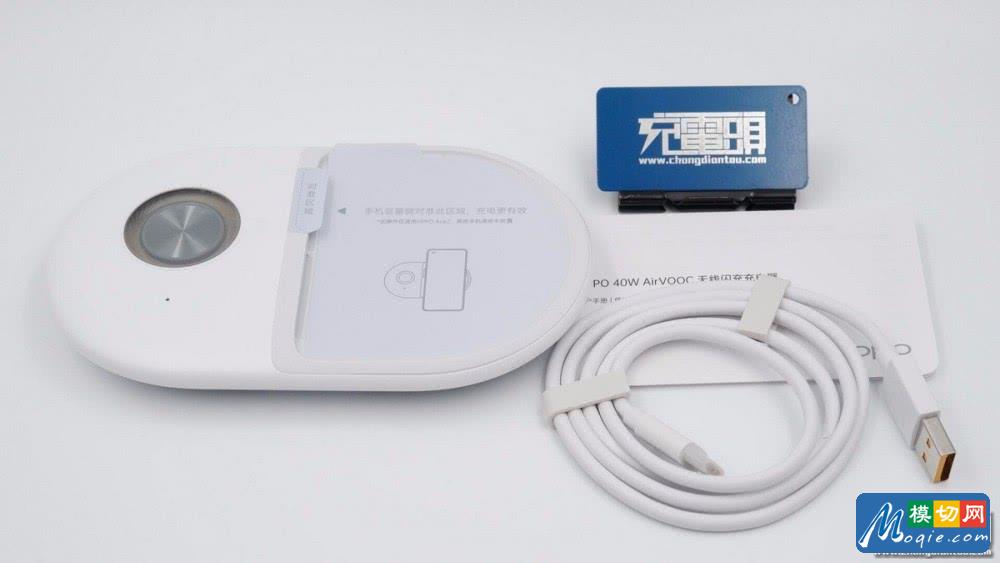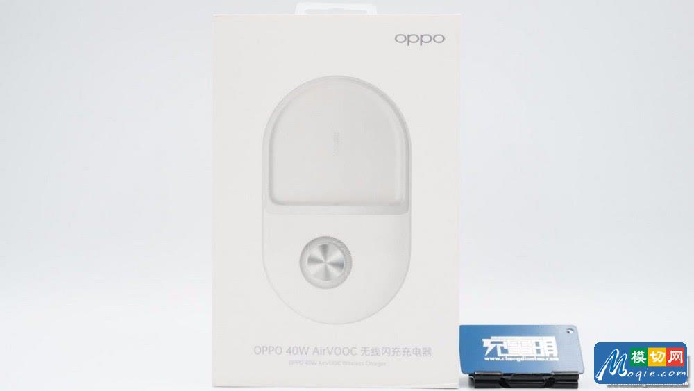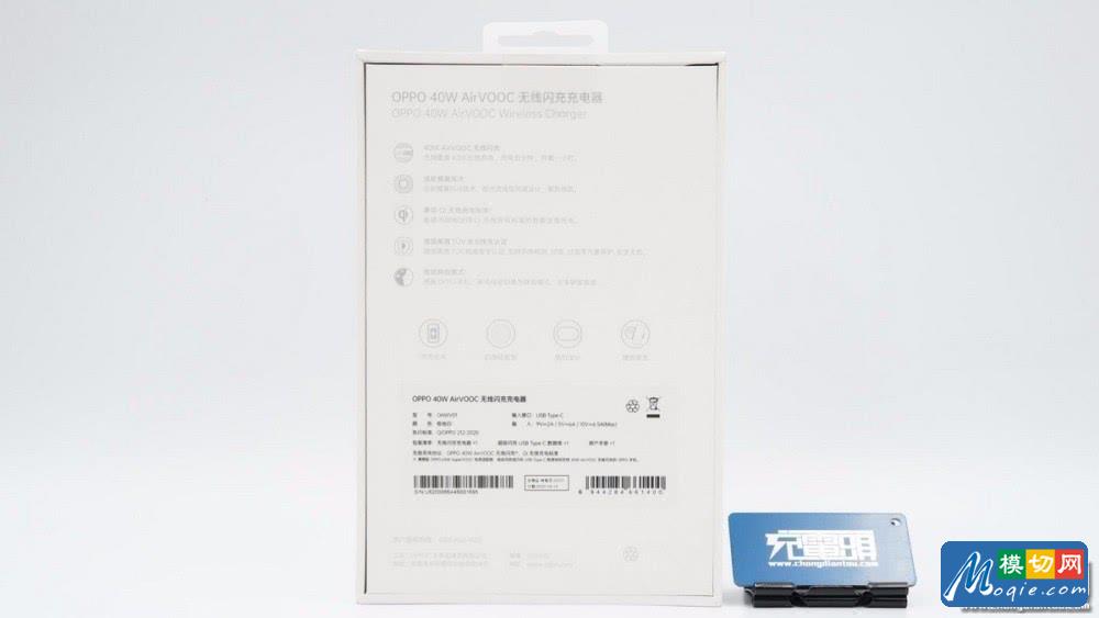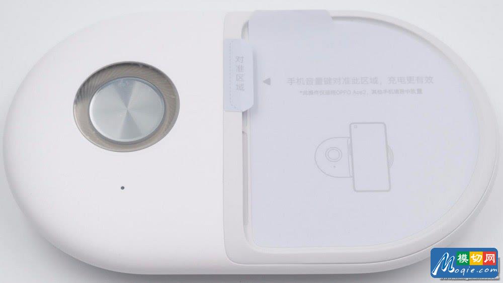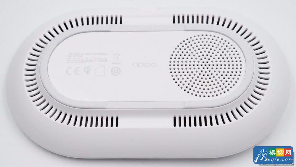 OPPO这款无线充电器采用卧式跑道造型设计,机身圆润扁平,设计简约。整个机身分为左侧风扇和右侧无线充两部分:左侧风扇部分和背面采用白色塑料外壳,表面哑光处理;无线充放置手机位置是深灰色橡胶,并贴有提示贴纸,印有手机正确放置标识。