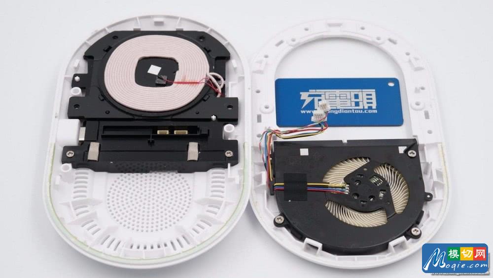 通过拆解了解到,这款产品内部风扇和无线充两部分之间通过导线插拔式连接,设计简单组装方便。无线充电部分采用了降压供电和典型的DC-DC升压和发射输出架构。