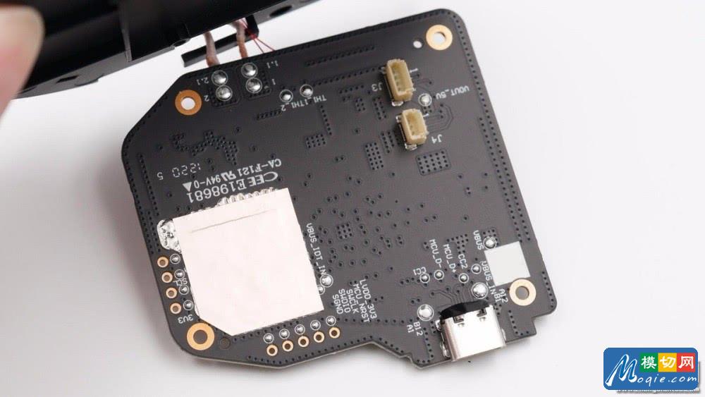 PCB板背面一览,没有焊接有芯片,左下角贴有一块铜箔帮助无线充电主控芯片散热,Type-C母座打胶加固。