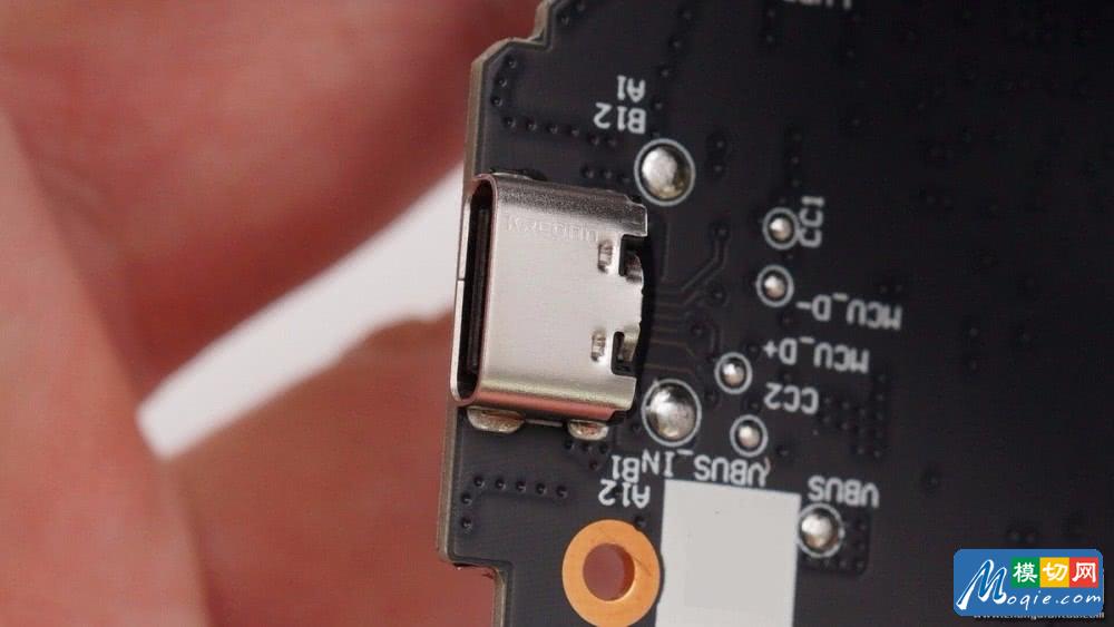 USB-C输入接口过孔焊接,金属外壳上凹印KRCONN字样,来自深圳市精睿兴业科技有限公司。