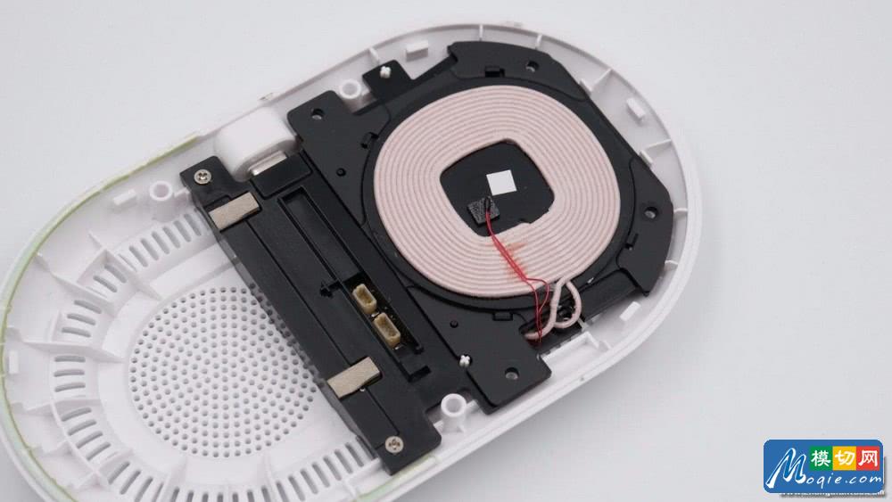 无线充电部分外壳采用卡扣和固定柱进行封装,拆下后发现机身壳边缘还有螺丝进行固定。