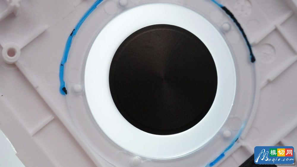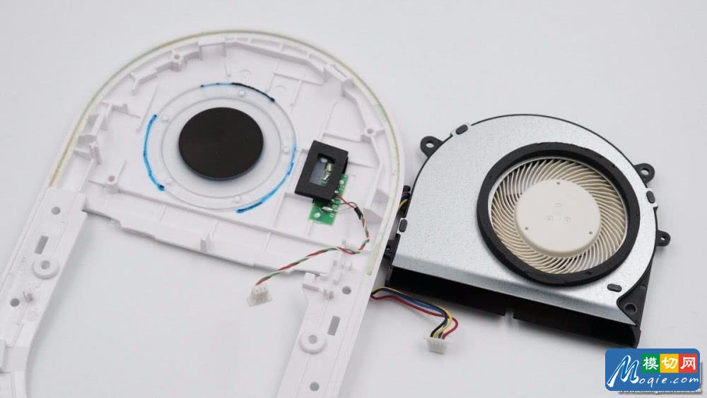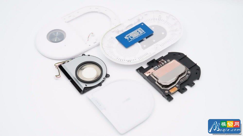 将机身壳拆开,外壳边缘同样采用卡扣进行封装。此外无线充和风扇均使用黑色塑料壳进行固定,塑料壳有螺丝和固定柱固定。