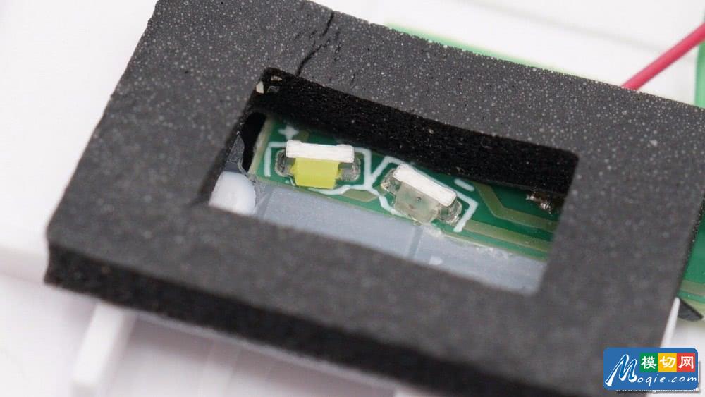 在扇叶下方是一颗白色LED指示灯。指示灯正常工作情况白灯长亮,异常状态下切换到红灯闪烁。