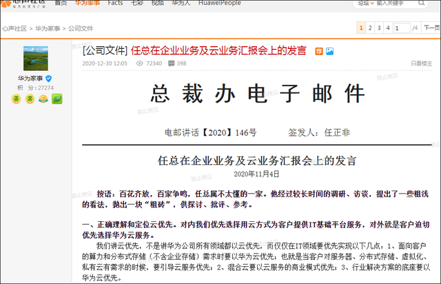 2020年12月30日,华为创始人任正非此前在华为企业业务及云业务汇报会上的发言曝光。