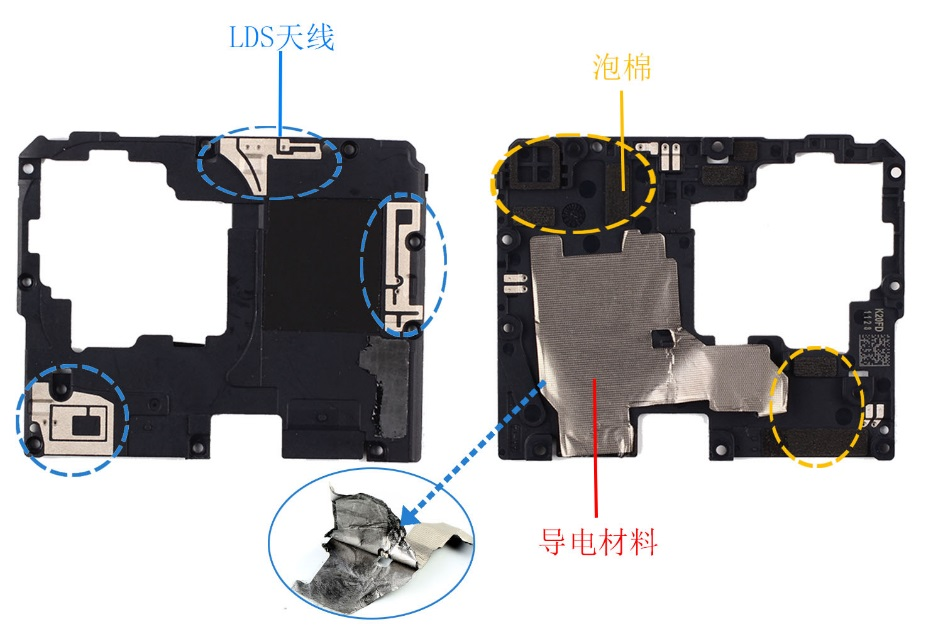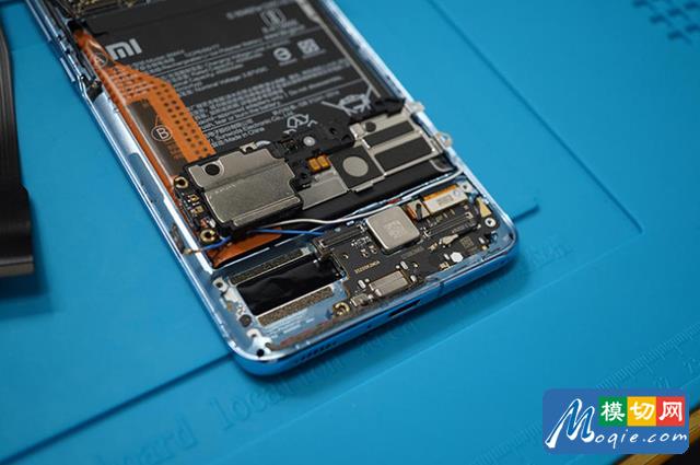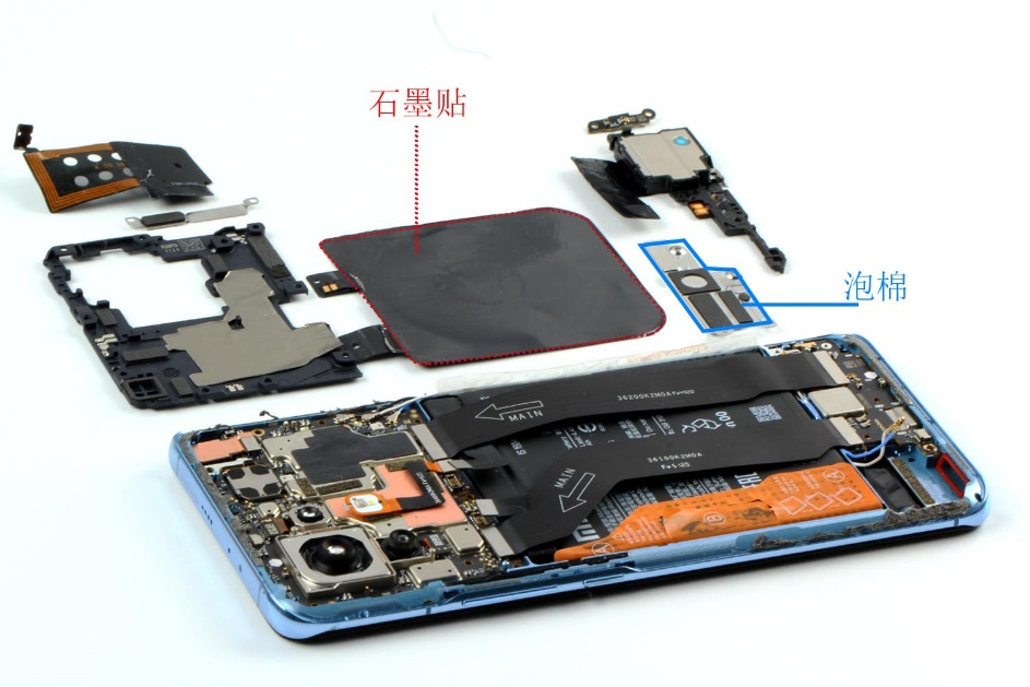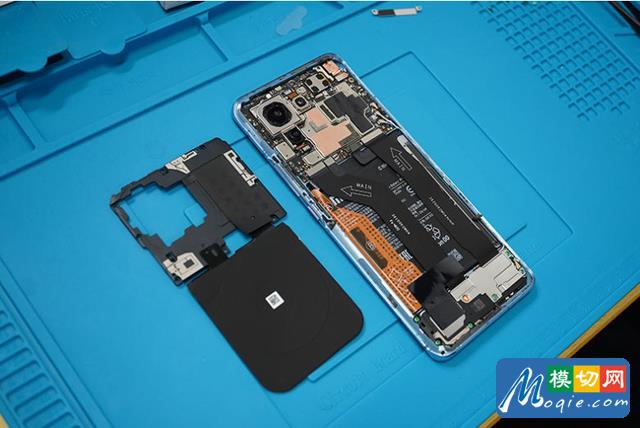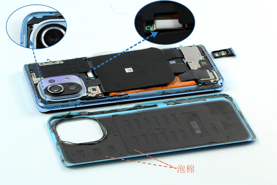 继取下将小米11的后置镜头盖后,将螺丝固定的顶部天线模块、顶部扬声器/天线模块取下。无线充电线圈以及NFC线圈是采用胶固定在顶部天线模块上,在无线充电线圈上有大面积石墨片进行散热,在副板盖对应接口和器件位置都设有泡棉,可以起到保护作用。