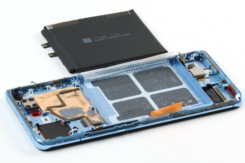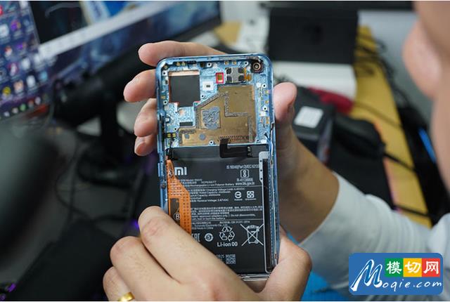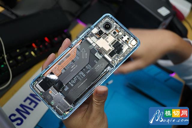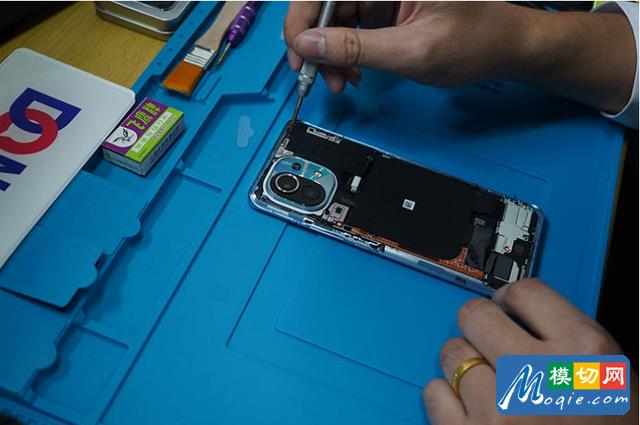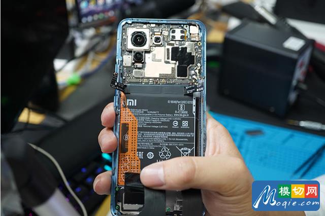 小米11的电池通过易拉胶纸固定,这样也便于拆卸。
