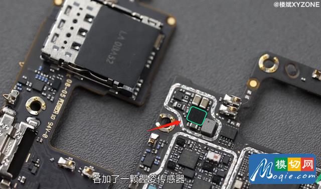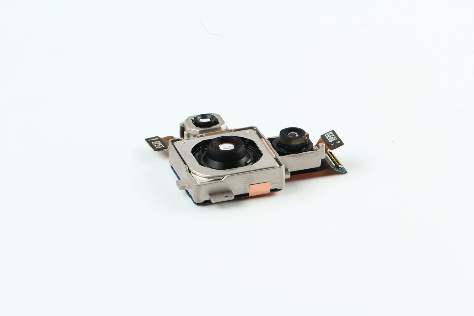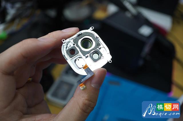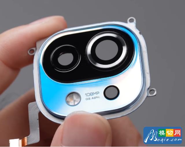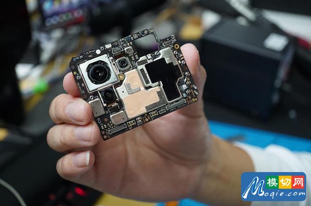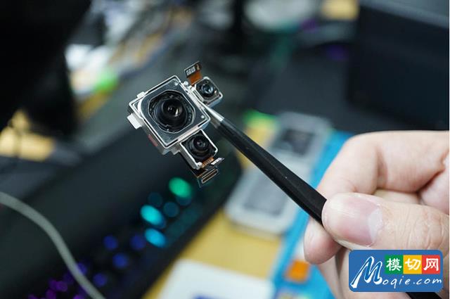 影像模组方面,拆解后发现,闪光灯是固定在镜头盖上的,而三个后摄镜头是独立在一个模块上。