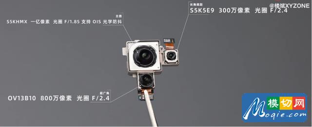 小米11后置三摄包括1.08亿像素主摄(三星S5KHMX 1.33”F1.85 支持OIS光学防抖)+13MP超广角(豪威科技OV13B10 F2.4)+5MP长焦(三星S5K5E9 F2.4)。