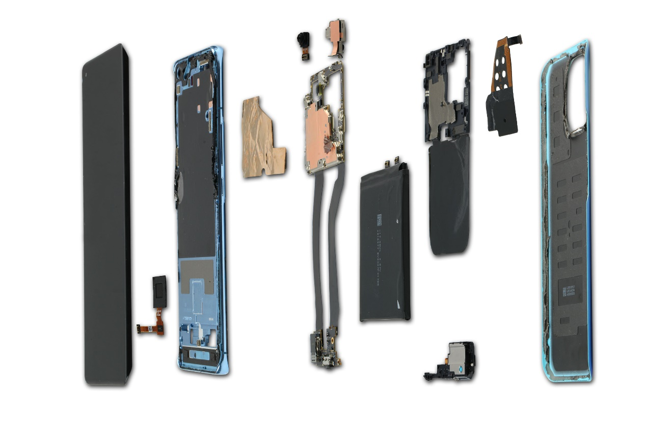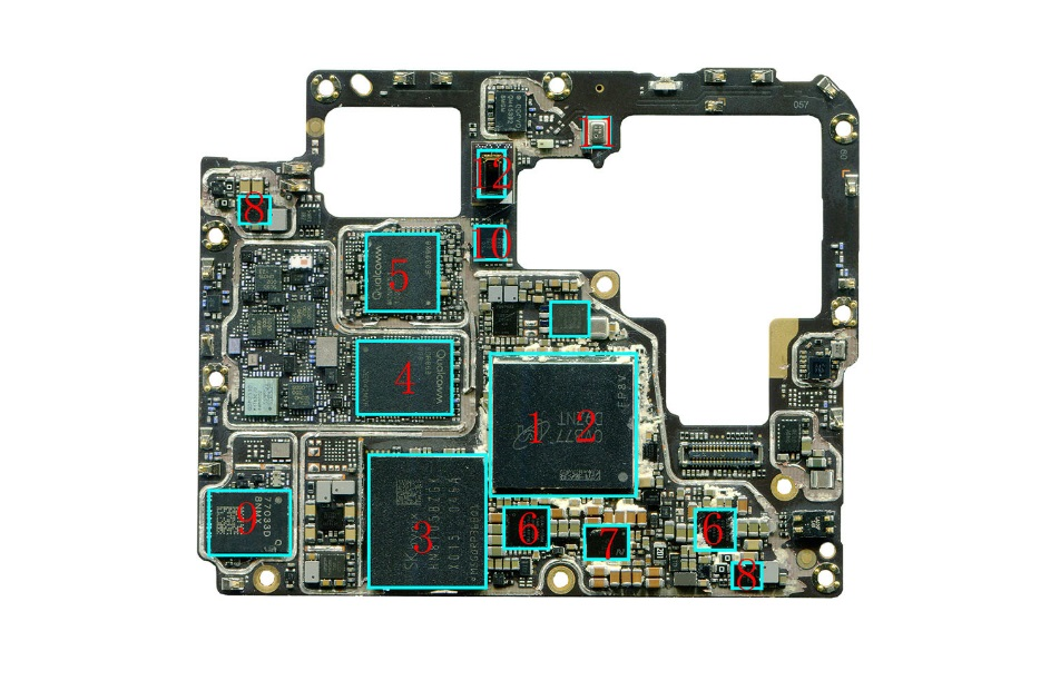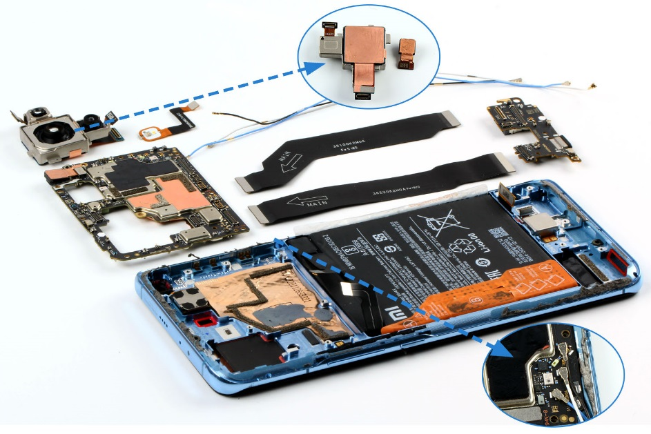 随后取下将小米11的主板、副板、主副板连接软板、前后摄像头模组和射频同轴线。在前后摄像头模组都贴有铜箔散热。3根射频同轴线都卡在内支撑的凹槽内,整体布局更加清晰。
