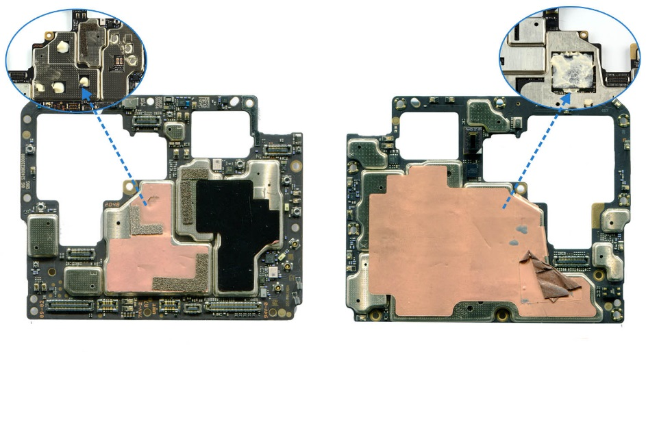 另外将小米11在顶部天线模块上集成3根LDS天线,模块背面对应主板BTB接口位置处都贴有泡棉保护,并且在对应处理器位置有导电材料,在下方还有层石墨片,可以有效的散热。