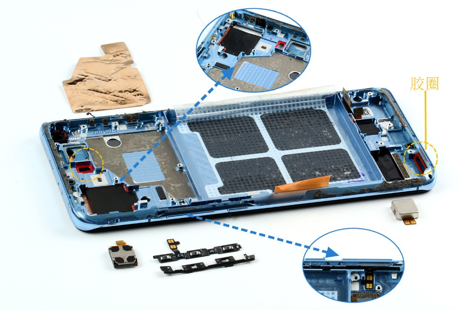在将小米11的内支撑上还有VC液冷铜管、听筒、振动器和侧键软板。除侧键软板通过黑色塑料片固定在内支撑上的凹槽内,其余都是通过胶固定。另外在扬声器和光感位置都设有红色胶圈,防尘之余,也可以起到保护作用。为了小米11整机更为轻薄,内支撑对应铜管特意做薄,对应后置摄像头模组位置也采用镂空设计。