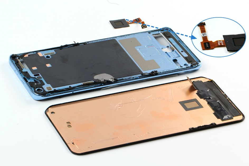 最后通过加热台加热分离屏幕和内支撑,在内支撑正面贴有大面积石墨片,屏幕的背面贴有大面积铜箔,触摸控制芯片处背面贴有石墨片。取下指纹识别,小米11的屏下指纹识别采用采用汇顶科技的超薄指纹识别模块,这是目前旗舰机的主流方案。