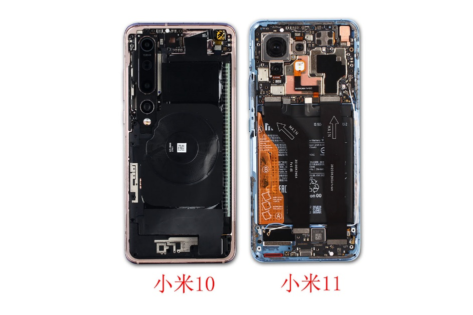 小米11和上一代小米10的布局相差较大,小米10背部左侧是主板,右侧是电池,整体结构比较少见,与iPhone有些相似,拆卸麻烦。小米11回归到常见的主板+电池+副板的三段式设计,内部布局清晰,拆卸简单。