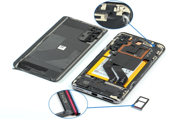 先取下中兴天机Axon 20 5G的SIM卡托,卡托上带有防水胶圈。从后盖拆起,后盖是用胶固定,故使用热风枪均匀加热后盖,便可用翘片拆下后盖。后盖上有固定的胶条,在中框上也有一层塑料胶。