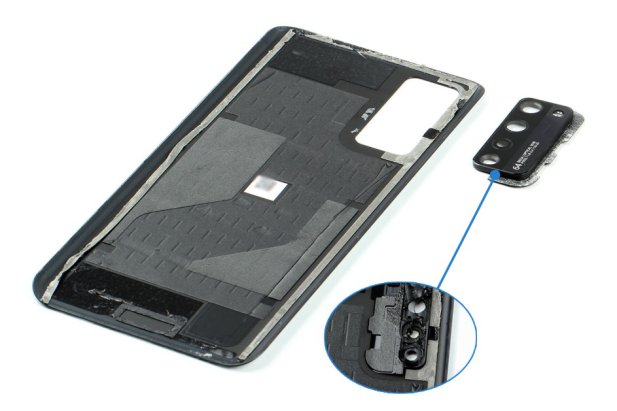 在中兴天机Axon 20 5G的后盖上贴有泡棉,石墨散热贴以及黑色塑料片。中兴天机Axon 20 5G的摄像头保护盖上贴有泡棉,采用双面胶固定在后盖上。