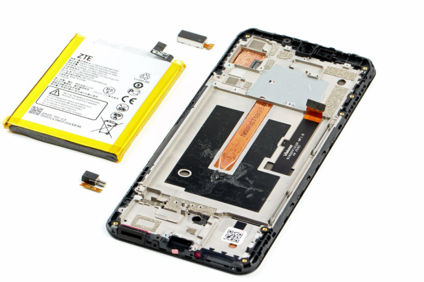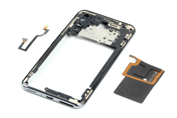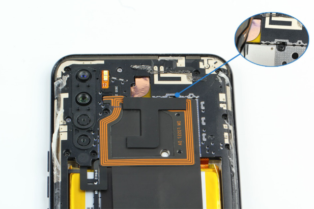 中兴天机Axon 20 5G中框上的NFC线圈和摄像头闪光灯皆由双面胶固定,拆解并不难。