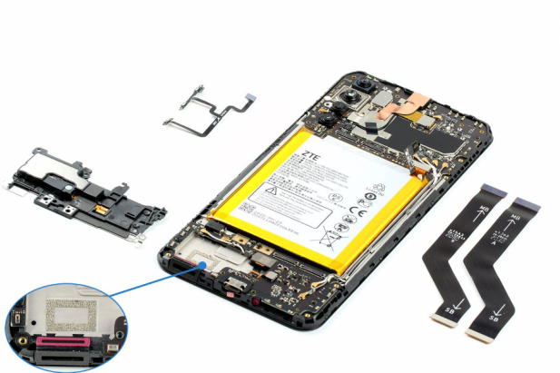 中兴天机Axon 20 5G的前摄像头四周贴有硅胶保护,电池下方有一个很小的转子马达。USB上贴有硅胶保护套。主板上有导热硅脂,但由于屏蔽罩粘的太紧,在拆卸时非常容易主板分离,遗留在内支撑上。