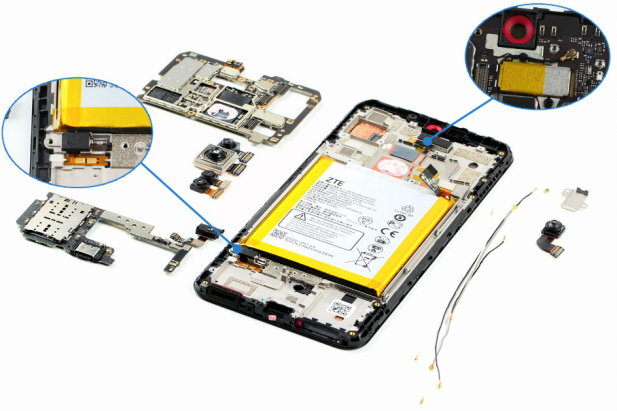 而后取下中兴天机Axon 20 5G的主板,副板,摄像头以及同轴线。主板和副板都是通过螺丝和卡扣进行固定,屏幕发声装置用金属盖板和螺丝加以固定。