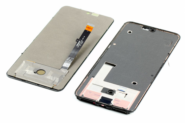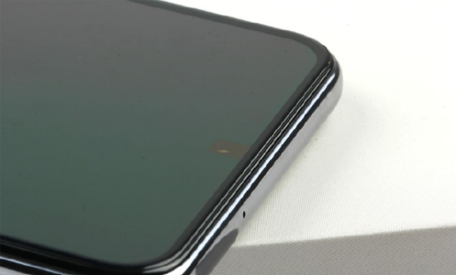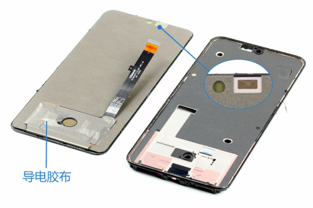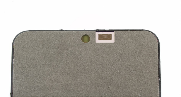 最后拆解屏幕,经过均匀加热屏幕,用撬片结合吸盘慢慢撬开屏幕。屏幕上方有针对前摄和光线距离传感的孔位。屏幕下方器件位置贴有导电布。