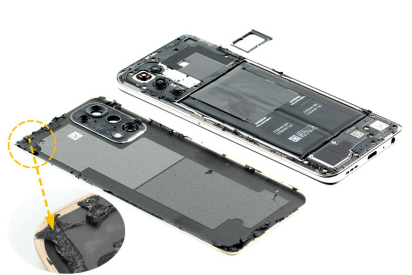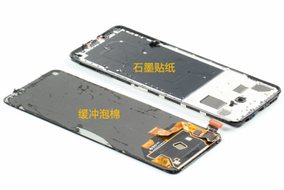 OPPO Reno 5采用6.43英寸OLED全面屏,屏幕与内支撑之间使用黑色黏胶固定,内支撑正面贴有石墨贴纸,屏幕背面有泡棉作为缓冲。